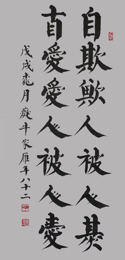如今的张家雁已逾耄耋之年,但对书法艺术怀有的一份承传以及弘扬之责任心让他还继续不懈于孜孜以求之研索精神。相信,他的执着能作为当今书坛后起之秀的楷模,而其平和淡然的心境更能让其书法艺术臻达更为致远之出尘造诣!