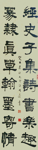 学书以隶为根,延伸章草,行草亦多有用功。创作中追求张迁碑的方劲沉着,章草的简约含蓄,平正中有韵致,苍劲中显奇巧,力求在墨迹中透出清雅超脱之气,给人以平正沉着、娴静恬适之感,以表达自己正气浩然,甘于谈泊、远离喧嚣的生活态度。