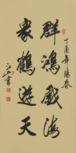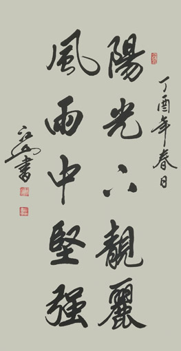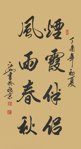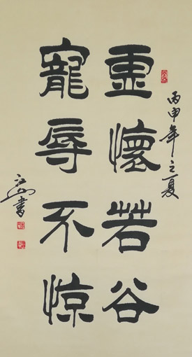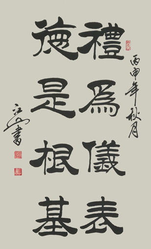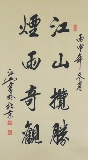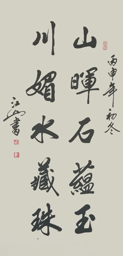 江山先生自幼酷爱文学书法,曾拜全国著名书法家王梦赓先生为师,扎实研练,默默耕耘。2005年以来尤其以书写冠名联见长,曾为包括国家领导人在内的社会各界人士书写冠名联七千余幅。江山书法秀美飘逸,雅俗共赏,多次参加全国书法大赛并屡获大奖。其中《沁园春·雪》,苏东坡词《念奴娇·赤壁怀古》等大幅行书作品,曾作为国礼赠送给韩国日本贵宾。部分作品已被欧阳询纪念馆,苏东坡纪念馆,李可染故居,中国盛世收藏拍卖公司,中国航空公司,中国集邮总公司等多家单位收藏。