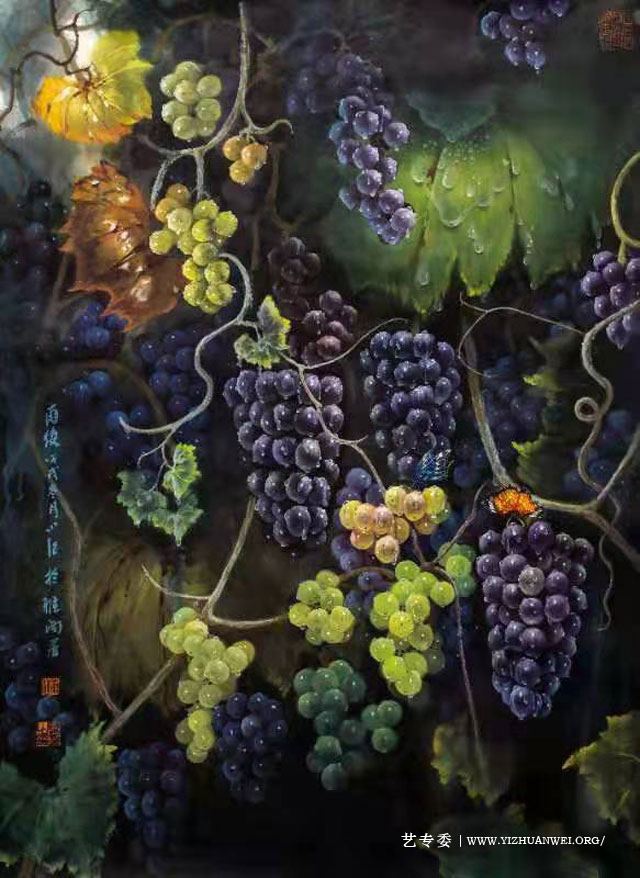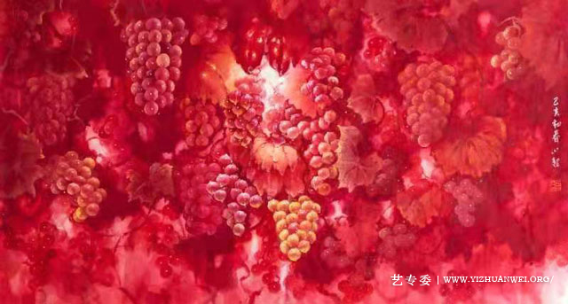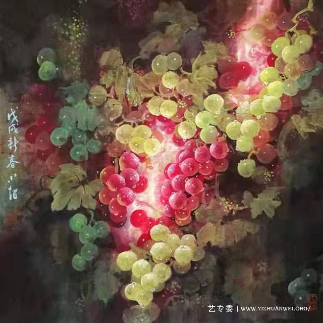 “肖葡萄”的作品从色彩的情绪营造、构图的奇巧布局,笔墨的不拘一格都展示出极强的艺术性,甚至有着强烈的当代性特点。多年来的笔墨耕耘,“肖葡萄”开创了以彩带墨,彩墨交融,不墨守成规,大胆借用西画手法。在传统的色纸上,渲染出带有浓烈的西画效果,使之作品的视觉效果更具世界性,从而开创了“肖葡萄”独特的艺术表现手法,打破了“越是民族的,就越是世界的”这一成套,使民族性和世界性相融合而更具世界文化的推广。梳理肖超的艺术创造之旅,你会发现这些“葡萄的变化”其实展示出很清晰的轨迹,在不断反思与总结中实现了自身艺术从传统性向当代性的蜕变,使之在世界艺术极具宣明的个性。