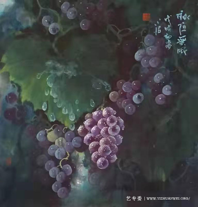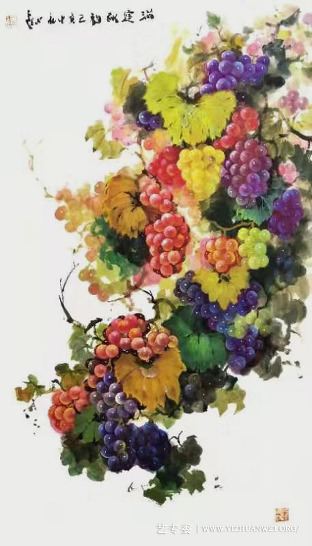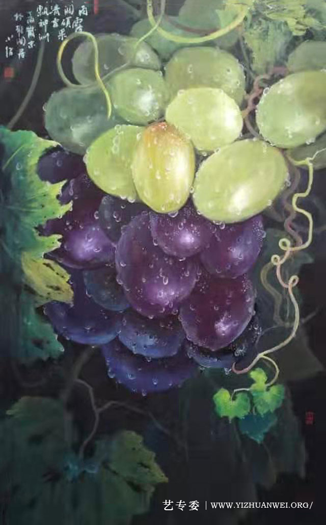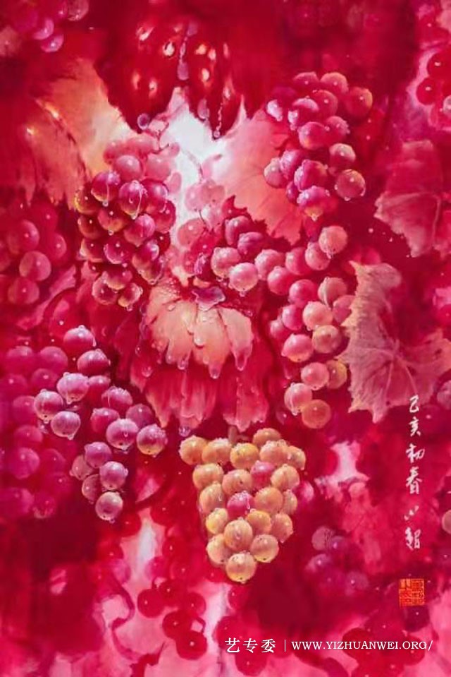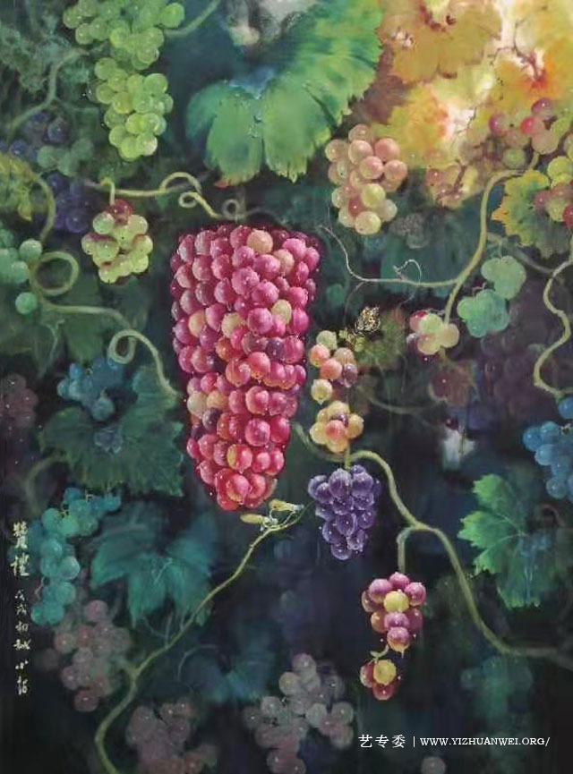 肖超,被画界誉为“肖葡萄”,他自创了中国“彩墨”技法,将传统绘画艺术与西洋绘画艺术相结合,融为一体,形成了具有鲜明个性特色的画风。他的画,以葡萄为代表,晶莹剔透,鲜活灵动,既有水墨韵味,又有强烈的视觉色彩,时代气息浓郁,因而受到藏家青睐。