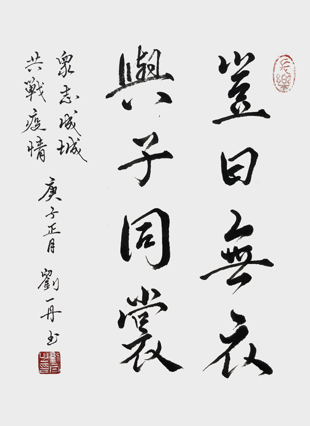 韩立作品《上下一心抗病冠,军民白衣勇向前。中华历来好传统,战士何曾论困难》