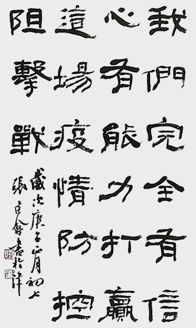 杨天佑作品《病毒成灾神州急,众志成城抗瘟疫,钟家南山临荆楚,瘟君还能闹几时。》