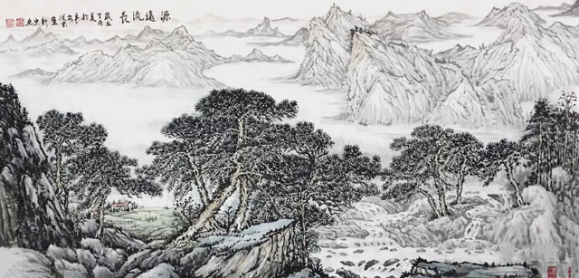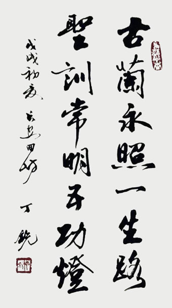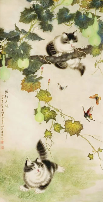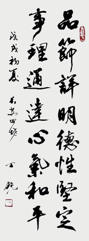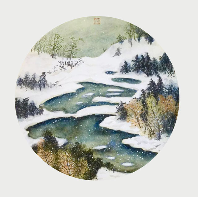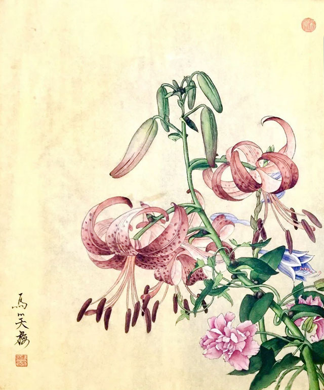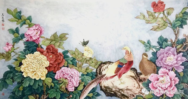 其作品高古,不染俗笔,不取邪径,雅正从容,端庄秀丽。构图多取纵势,物象挺拔。其画如大家儿女仪范,绝不搔首弄姿而风神自显。博得各位老师的赞誉并连续三年举办了个人作品展。