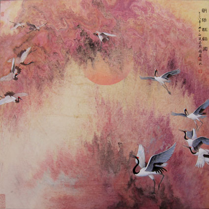 《朝阳瑞鹤图》当代帛画