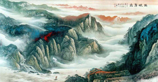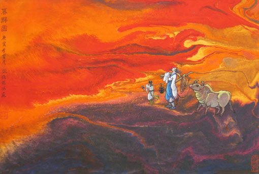 董文政禀赋颖异在于对绘画的研究与创作上,他从绘画最细胞、最通识的古代就是依托材料的丝绸开始,如果说他选择了丝绸还不如说丝绸选择了他。他研究丝绸性能、结构、组织及染料的亲和力以及助剂在印染上色中的控制作用,他甚至比工科院校毕业生的技术员还要谙熟内行。他把这一切用于丝绸画的创作上,自由是对规律的驾驭,浩瀚八荒,玄资宇宙,依仗天马行空般的挥洒,让丝绸静谧的柔情,走向艺术的张扬。飘渺的烟云,流动的色彩,简直就是“上帝第一推动力”的显现,色相之间绝不混淆,豪无人工之凿迹,自然天成,水乳融谐。无论是红霞满天还是黑入太阴,无论清风晨露还是行云流水,一切的优雅但不令走向纯粹的抽象。作者那种不露行迹的自信,阻燃绘画张力的疲软。董文政的丝绸画的创作“在天成象,在地成形,变化见矣。”(《周易·系辞上传》)