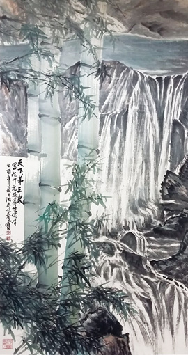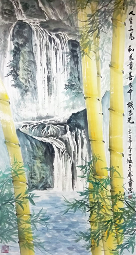 《人生三修练》寓意,人生哲理与大自然互动,以瀑布、小竹生长在石边的坚强意志,不屈不劳的精神所发挥的能量……