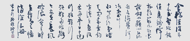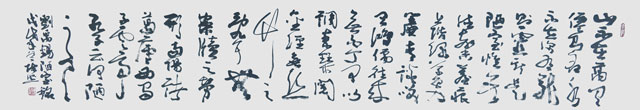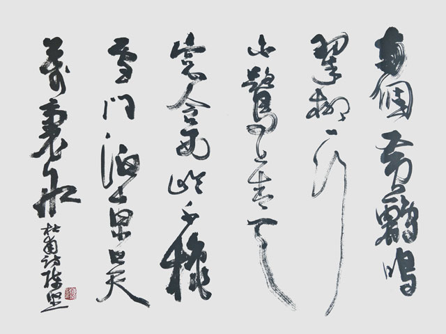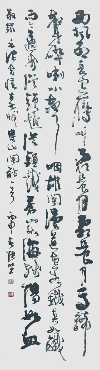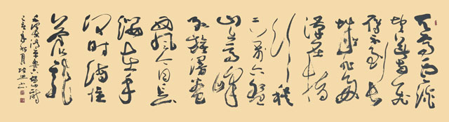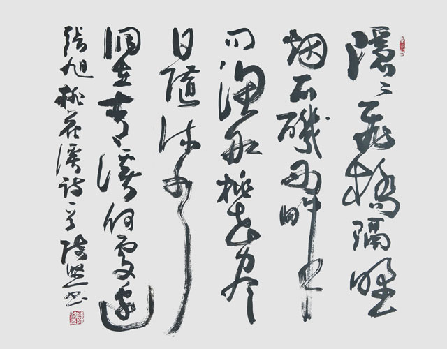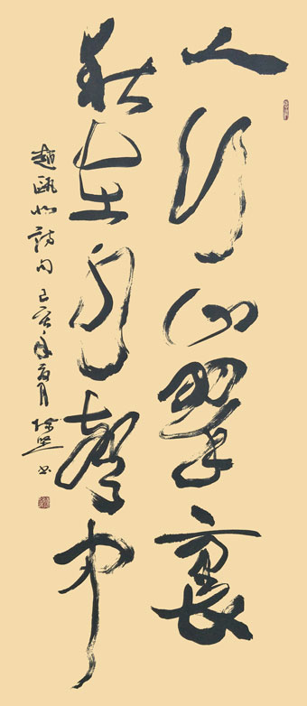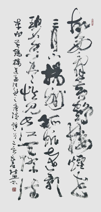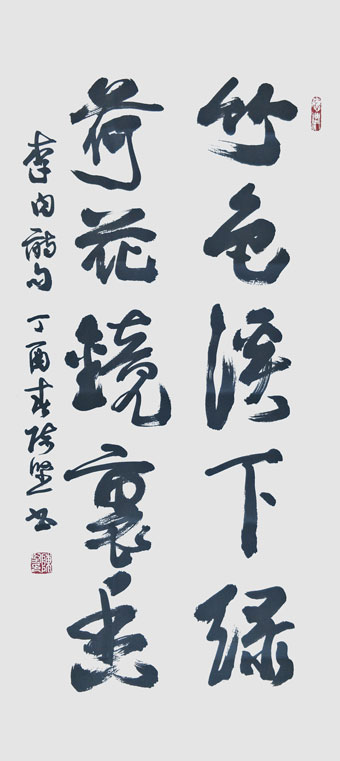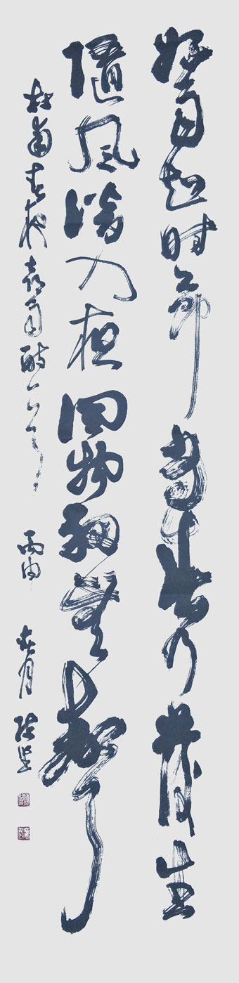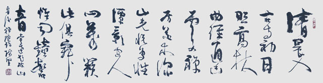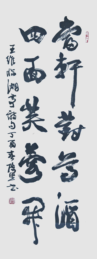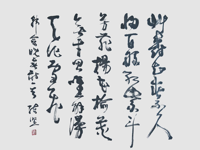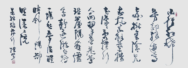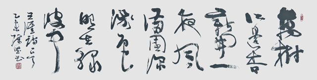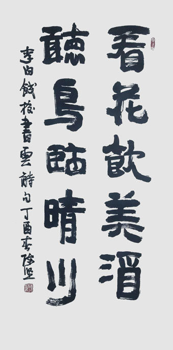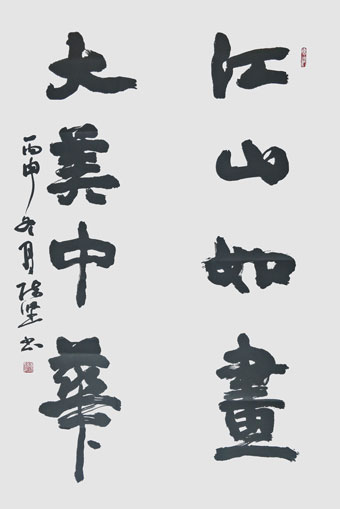 1976年,陈坚带着他的“书法梦”步入了军旅生涯,在军队里磨练出了强健的体质、坚毅的性格和细心的秉性。经过南京军区测绘大队的书法课程培训,他又考入解放军军事经济学院深造。师从王冰石、战友谢少承,金德欣、毛锡雄、李佐、臧科等名家,研习古人书帖神韵。几十年来,陈坚在书法方面下了十足的苦功,无论是在军队或地方,不论工作多忙,“书法”一直都是他始终不变的追求。他以颜柳楷书入门,习“二王”、米芾、王铎行书,又探究怀素《自叙帖》、张旭《古诗四帖》,学有所成之后主攻行书、草书,尽情地在奔放、流畅的书法世界释放性情。走进陈坚的书法世界,在严谨章法中彰显楷书笔法及魏碑透力的深厚基础。从结体来说,其字重心平稳,欹正相错。既有端庄平直、疏密匀称的体势,又有跌宕起伏,纵横参差的体势;一正符合“法”,一欹富有意趣,两者结合相得益彰。合理用“点”,恰到好处。或为加强呼应,或为求得平衡,实现字体协调之妙。笔画富于变化,或长或短,或粗或细,或仰或俯,相互协调和谐,灵活生动。其章法布白虚实相间,开合自如,错落有致,别有情趣。通篇作品在简单中孕育变化,刚柔并济,既是陈坚炉火纯青技艺的体现,又是其洒脱随性内心追求的折射。作品于沉厚刚劲之中又见柔婉灵动,达到平和的境界,丝毫不见浮躁的张狂,在书法中融入道家哲学,让人在笔墨中观人生百态,悟人生之理,见人之真性情。当今书坛不乏能写的艺术家,但深受不正书风的影响,消退创作热情,艺术水平只能停在“匠”的程度。难能可贵的是,陈坚源自对生活的美好向往,坚守创作初心,达到了艺术臻美的高度。他表示:“心态跟书法创作关系十分密切。若是只追名重利,不潜心钻研学问,决不可能学有所成,以浮躁心态驱动创作,也就注定出不了好的作品。”他追随古人高雅的格调,以淡泊为气节,以“心如止水”的心态,力求弘扬“真善美”。正是这种精神追求,决定了作品格调层次之高。