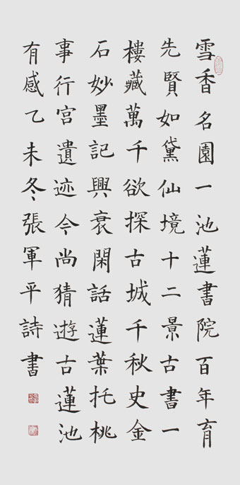 张军平,1953年出生于保定市,原保定画院党支部书记、副院长,现为中国书画家协会副主席、深圳时代书画院副院长、中国书法家协会会员、国家一级美术师、河北省作家协会会员、河北省书协草书委员会委员、保定市书协副主席、河北大学艺术学院客座教授、北京非遗与设计学院客座教授、中传笛声民俗文化(北京)有限公司首席艺术顾问、北京画院王培东工作室专职画家。从事书法教育20余年,出版发行书法专著10余部,其书法作品曾在中国美术馆、香港、澳门、台湾等地展出,多次在全国、省、市级展赛中获奖,并被俄罗斯、沙特阿拉伯、塞尔维亚、委瑞内拉、阿尔巴尼亚、利比亚、奥地利、玻利维亚、越南驻华使馆收藏。2015年9月,参加中国外国语大学、中国孔子学院总部率团赴欧中国茶道三巡文化活动,30余书画精品在德国杜塞尔多夫孔子学院展出,在德国慕尼黑艺术大厅受到中国驻慕尼黑领事馆朱万金总领事的接见。2018年3月随中国书画家代表团访问赤道几内亚进行文化交流,传播中华文化,受到中国驻赤道几内亚大使馆陈国友大使的接见。2019年5月,应中国驻朝鲜大使馆之邀,随中朝文化交流团在朝鲜进行了访问,在首都平壤参观了朝鲜美术馆,与朝鲜艺术家们进行了文化艺术交流,在中国驻朝鲜大使馆受到了李进军大使的接见。