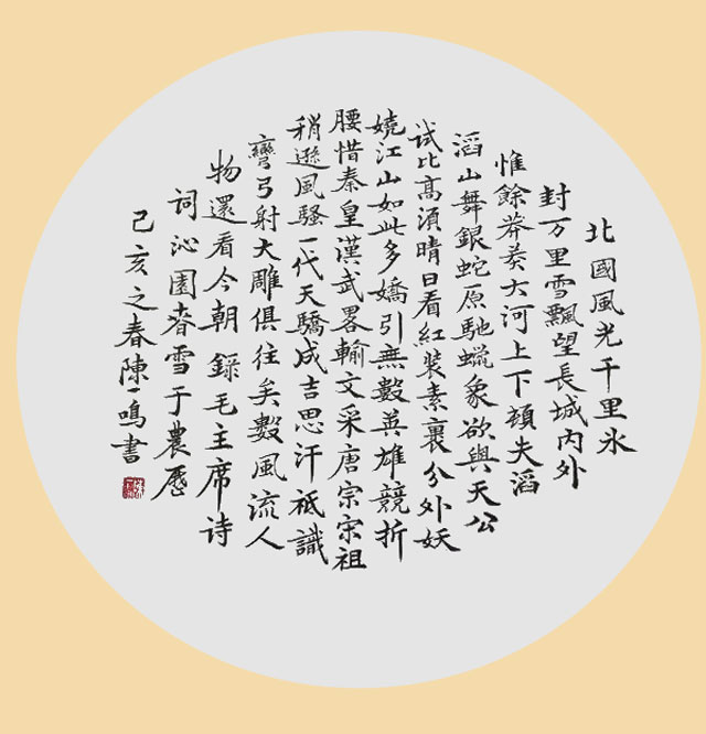 陈一鸣,江苏省南京市高淳县人,现在红宝丽集团工作,世界教科文化组织艺术执行委员,中国书法家协会硬书委、江苏省书法家协会。中国书法美术家协会副主席,中国国际书画研究会院士,世界艺术家协会会员,中国硬笔书法协会会员,一级美术师。正楷、行书、草书、隶书尤为专长,多次在全国书画大展中获奖,作品被全国友人收藏。2019年9月成为中国民族建筑研究会书画艺术研究会会员。