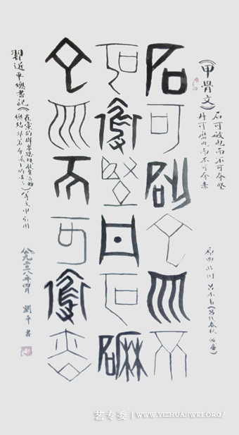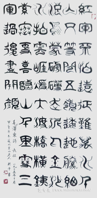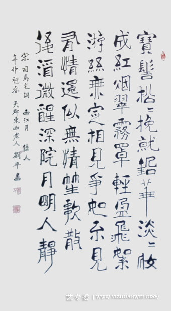 刘平,1931年生,江苏省苏州人,五岁随父学书,临池十年。1947年参加革命,1948年7月入党,在部队曾荣获“解放奖章”“淮海战役”“渡江战役”纪念章等。1979年转业回苏州担任学校(大专)党政领导并兼课(职称大学讲师)。1992年离休后,曾在全国各类大展赛中获各种奖项一百多次。出版作品集十多种,荣获“德艺双馨艺术大师”“全球华人最具影响力艺术家”“感动中国文化人物”等称号,曾被聘为“宋庄国际书画院终身院长”“英国皇家艺术院、荣誉院士、客座教授”等多个职务。并荣获苏州市“优秀老干部党员”“四好老干部”等。最近2018年4月又荣获“原文化部和旅游部”的“国家级非物质文化遗产”“刘平特以书法”的荣誉证书等(均有证书)。