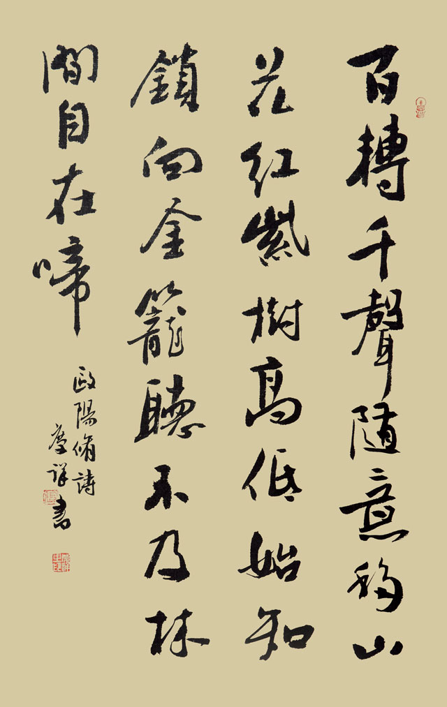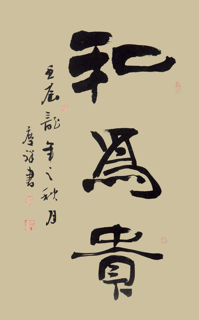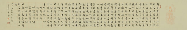 张庆祥先生从楷书入门,吸收颜、欧、赵等楷家墨韵,笔耕不辍,同时兼修篆、隶、草、行诸体,融各家之长为己用,尤以行书和隶书所见长。其书运笔稳健流畅,不见涩滞,中锋侧锋兼而用之,且使转自如,结构欹奇险正,跌宕有致,字与字,行与行之间相互映带,顾盼生姿。