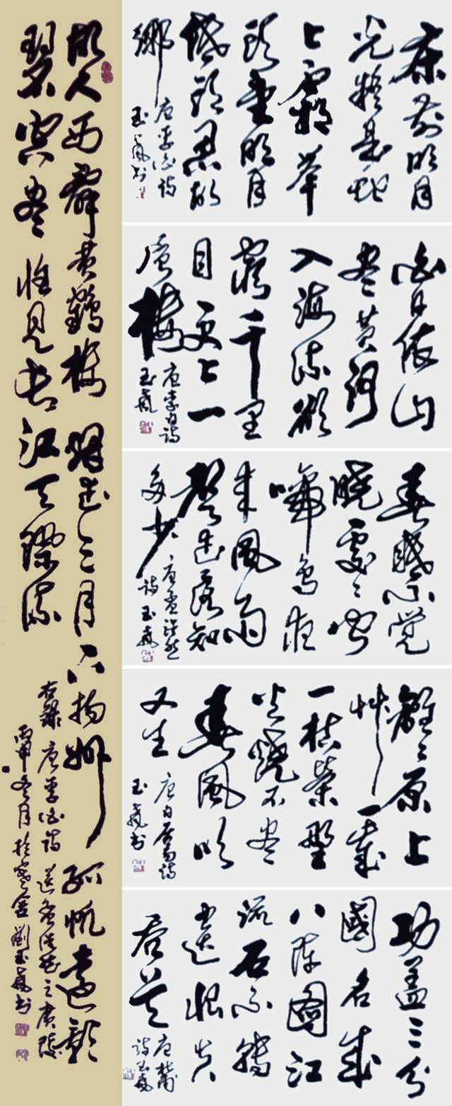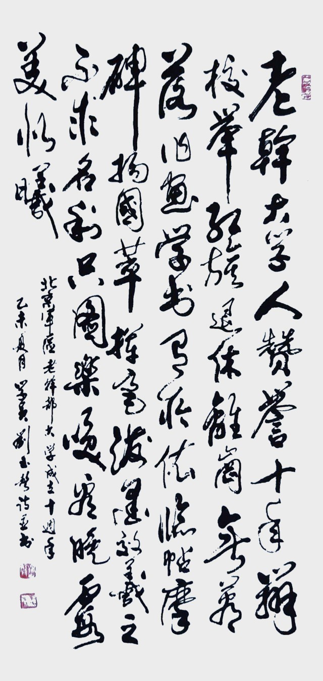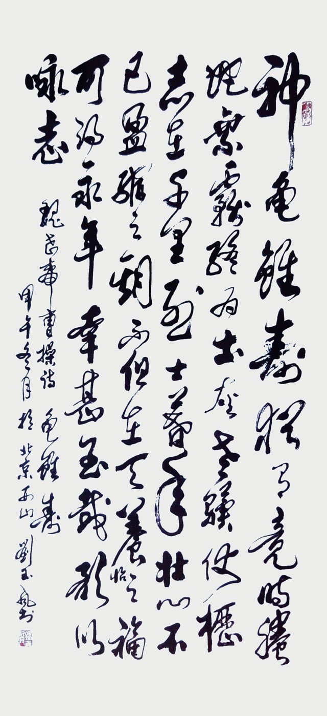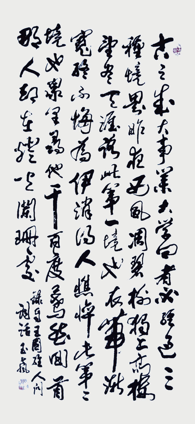 刘玉声自幼酷爱书法,长期从事书法习作,60多年孜孜以求,从未间断。当初以隶书、楷书起家,临习《张迁碑》《曹全碑》、汉简,以及欧阳询、颜真卿等名家法帖,之后潜心研习行草书,临习“二王”、张旭、怀素法帖,《孙过庭书谱》和毛泽东墨迹,在长期实践中形成了自己的独特风格,笔力苍劲、雄浑大气、章法严谨、流畅飘逸。先后参加全国“长城杯”精忠报国书画展、“埇桥杯”孝行天下书法展等大型活动,作品获奖并被刊发。退休后,刘玉声致力于研究书法创作、培养书画人才、传承建安文化,多次参与组织市、县专题书画展,主编了《建安风骨》《古邺新貌》《七一赞歌》等书画专集,培养了省、市、县级书画协会会员近百名,深受当地书画界人士的拥戴。