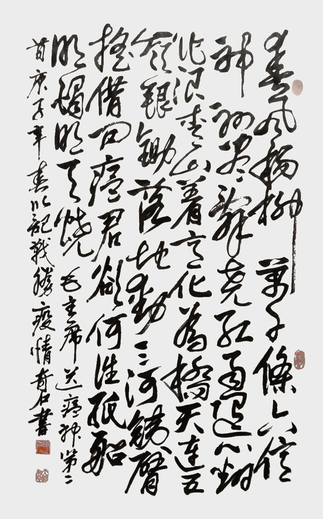 历经数十年风雨,书学稍有理论心得和见解,临池间先有笔与手之间相互交融的感觉,方才会在宣纸上找出挥洒渲泄的感觉,而后才能有墨与心升华的感觉,即手感、笔感、纸感、墨感、心感五种感觉俱融时,方能写出好的作品。