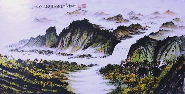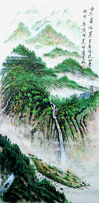 他的大青绿山水笔力雄沉,赋色流丽,以雅致胜,以雄悦心,有非常耐品的内涵。看他的画,如品一杯禅茶,先品其味,再品其意,味与意会把审美推向境界的体念,从品其味、知其意的回环中,走上我明我志的高度,体会到江山本是“画内美、静中参”的审美意象。大青绿的构建之品,品位在于“有气”,有气质,有气势,有气韵,笔墨丰神,魅力无穷!