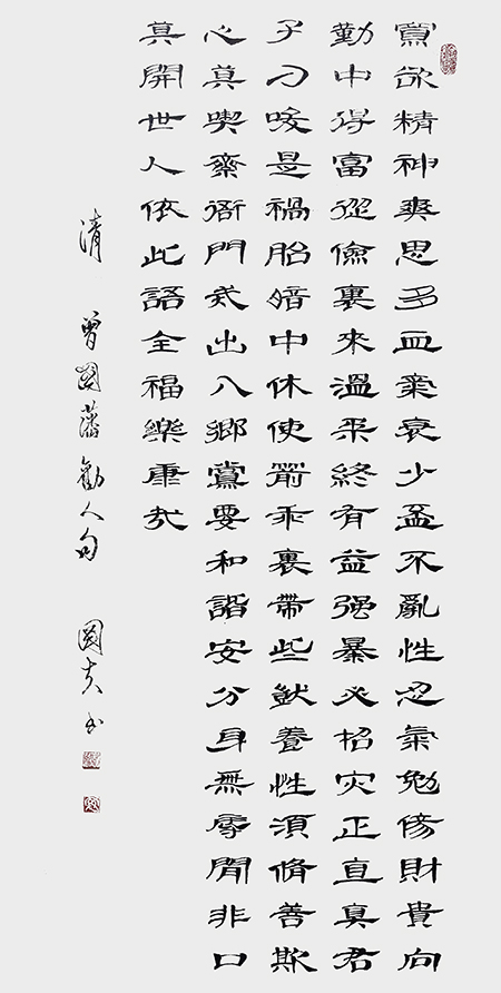 理论上学习了西汉时代蔡邕写的《笔论》《九势》、隋唐时代虞世南写的《笔髓论》、两宋时黄庭坚写的《论书》、元代赵孟頫写的《论宋十一家书》、清代宋曹写的《书法有约》、近代沈伊默写的《书法论》。从这些书论中了解了解先祖对书法艺术的思考经验,总结论述。这对其临习碑帖有很大的提示作用。尤其前些年得到了蒋维崧、刘炳森等导师的亲承善诱、传道、释疑。使其对书法艺术有了更深的理解,创作能力有了新的提高。其作品多次参加全国大赛。作品《古诗四首》《毛泽东诗词》入展多项邀请展、中日首届精英邀请展。九十年代获得“中华杯”“希望杯”、全国书画比赛青年组一、二等奖。作品曾发表在《北京晚报》《天津日报》《德州日报》上。2012年12月在全国书画比赛中获一等奖。2020年被评为“民族艺术领军人物”。