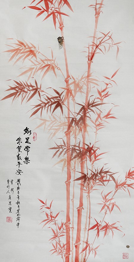 侯恩宝大师用笔自然、一气呵成,表现竹的无限生机,浓淡相映、妙趣横生。其画构图新颖、手法生动、润笔豪放、色彩鲜明、韵味悠长、雅俗共赏。“蝉”与“禅”同音,竹与蝉画在一起,意为高风亮节、知“竹”常乐,表现出竹的神韵与气节。整幅作品意境深邃、寓意美好,收藏潜力不凡!
