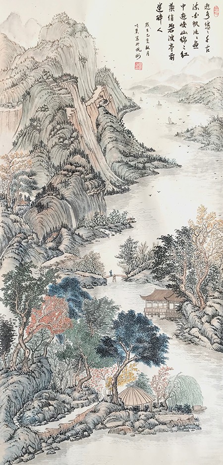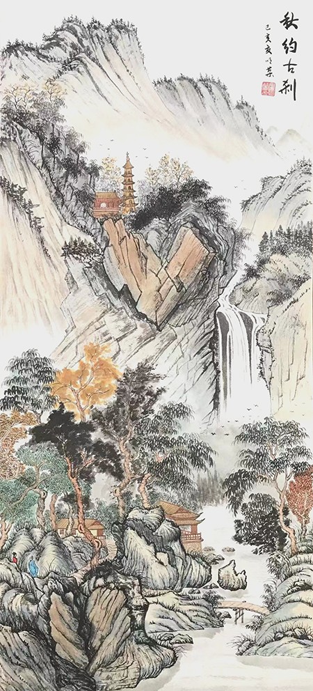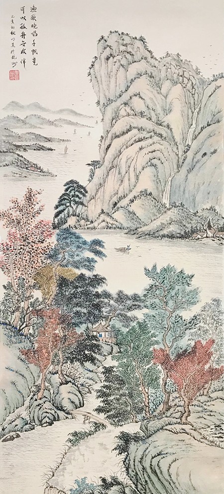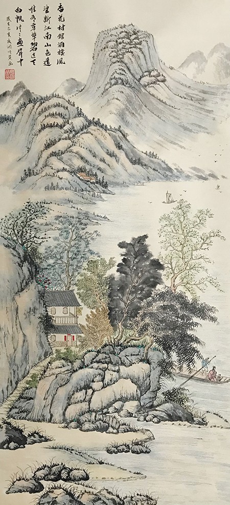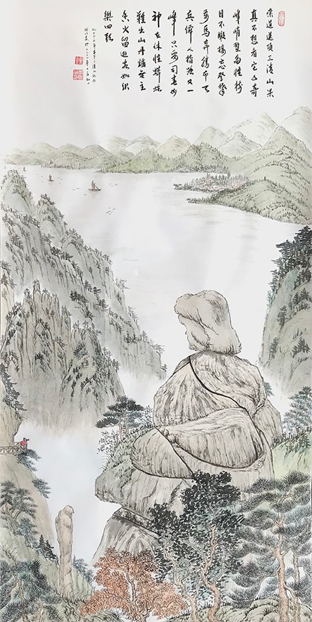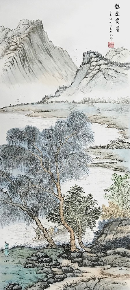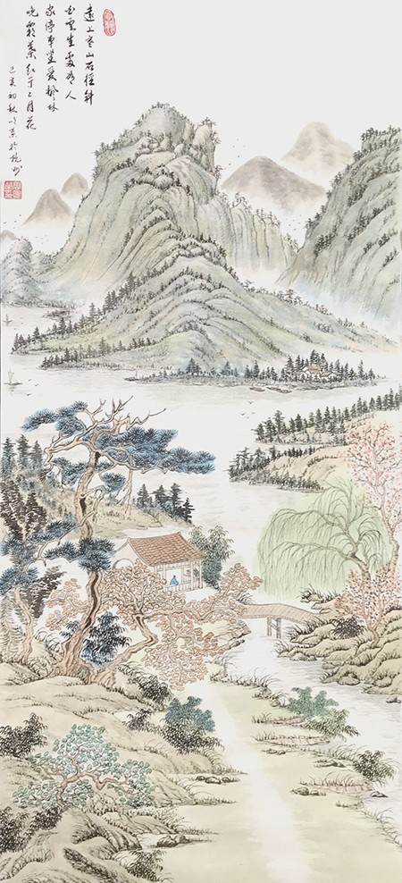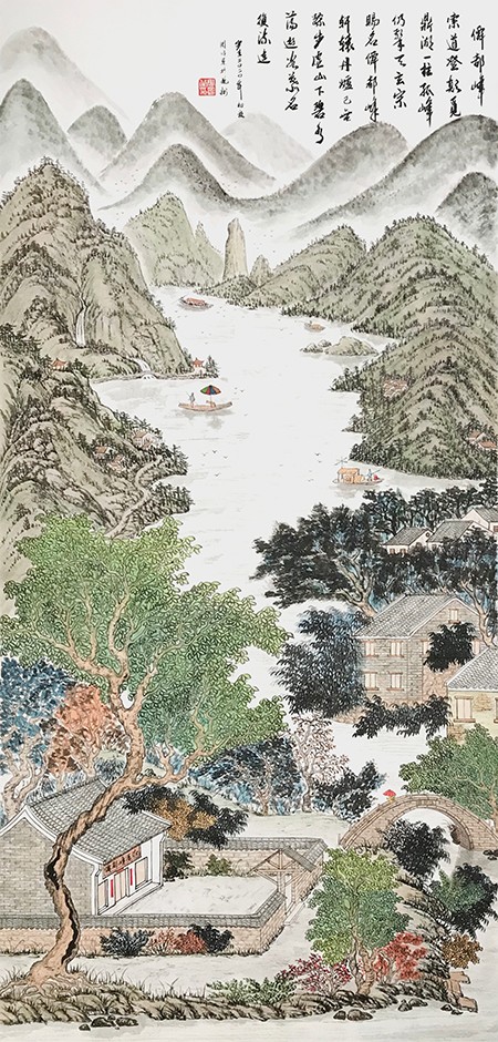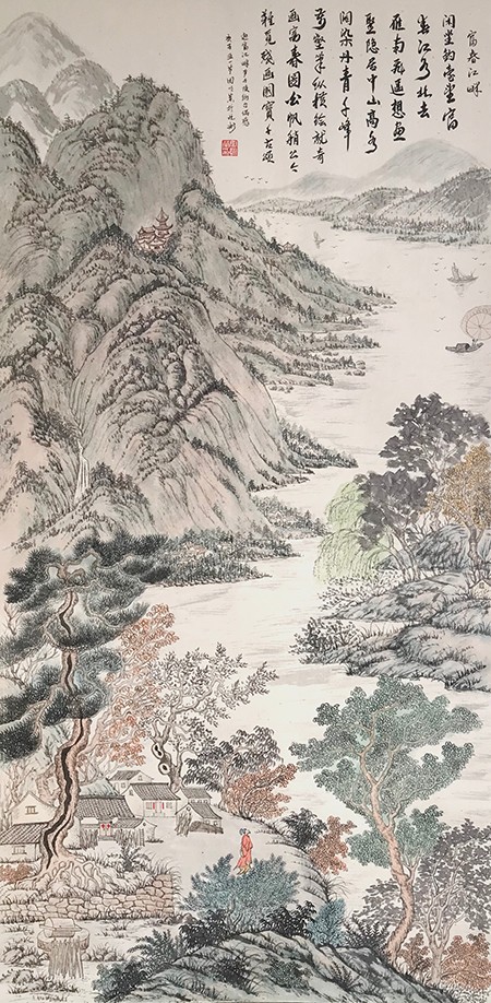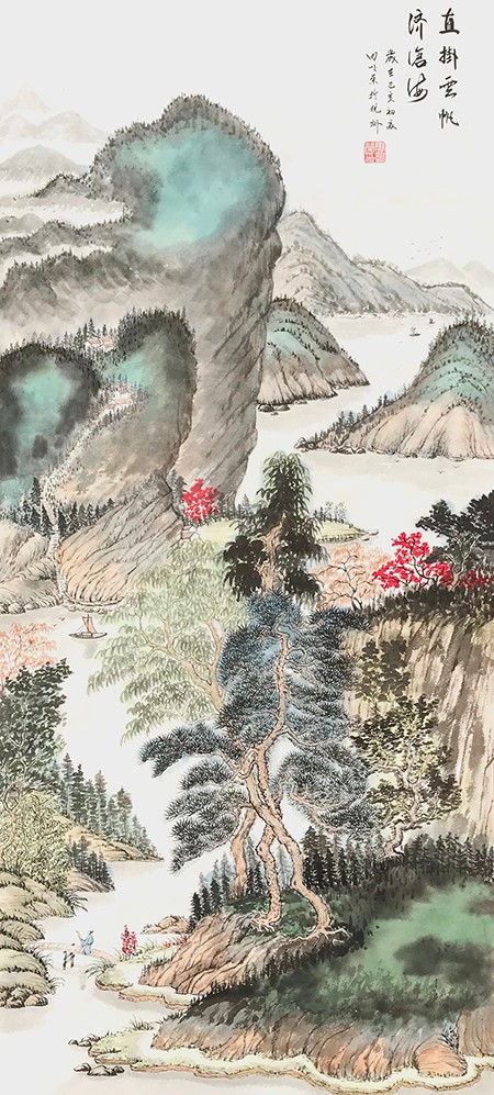我觉得一幅好的画,必须是雅俗共赏的,不仅要专家说好,更要让普通大众说好,对于美的东西,应该是有共性的,它给人以愉悦,既有美的享受,还能带给人以启迪。有位老画家曾经说过,如果每天能在一幅作品的前面停留3秒钟,那这幅作品就是成功的。我想这也就是作品所体现的魅力,让人能情不自禁的去欣赏。而我就一直在努力探索这一境界。我始终秉承传统山水“三远四可”的法则,“三远”即“平远、高远和深远”,尤其是“深远”,它突破了西画一点透视的桎梏,可以让我们创作出类似于鸟瞰图而又优于鸟瞰图的多点透视的视觉效果;“四可”即“可行、可观、可游、可居”,它更加赋予了山水画诗情画意的艺术魅力。因此,我在创作中特别注重“三远”的布局以及“四可”的内容。在我的作品中基本上能找到舟船小桥、蜿蜒小路、江湖河泊、渔夫樵子、棋人高士、农夫牧童、亭台楼阁,村野山居等等,给单调的山水画面赋予了一定的遐想空间。其实,这些元素就起到了画龙点睛的作用。