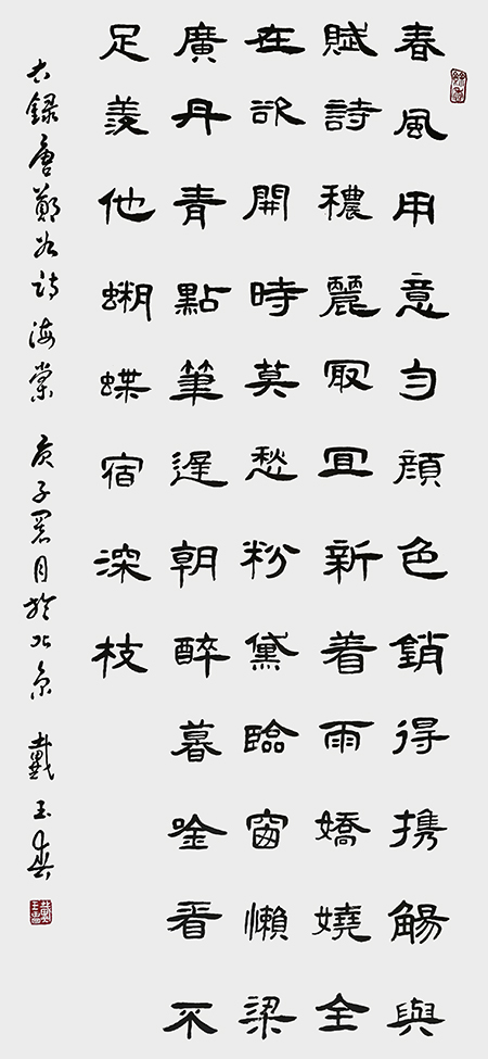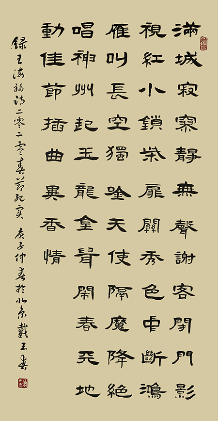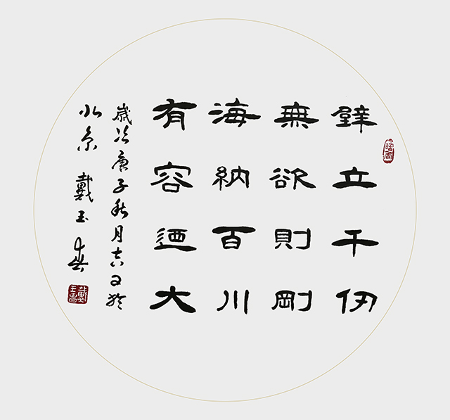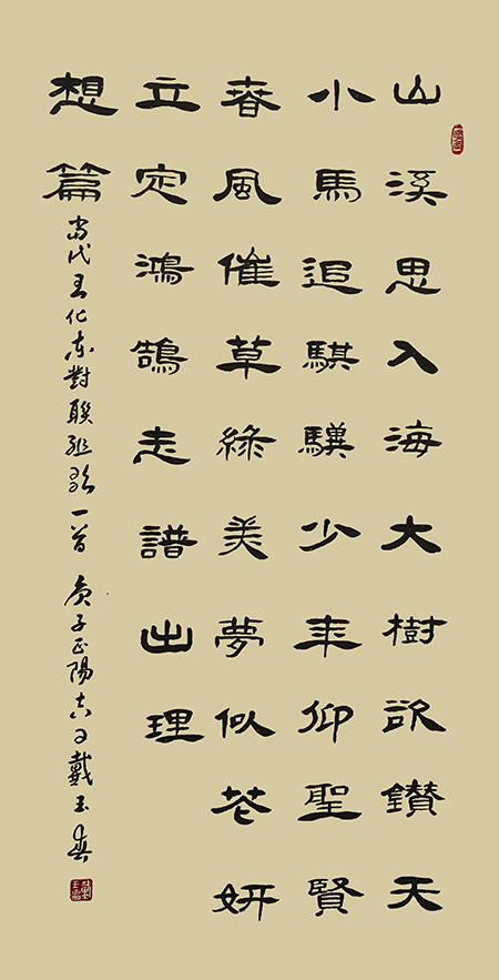 戴玉春,1953年9月生,博士学位,国家特级书法师。现为中华文化形象大使,中国文联世界名人艺术研究协会副主席,中国社会艺术协会常务理事,中国书法家协会会员,中央国家机关书法家协会理事,联合国和平书画院终身院士。作品被认定为“一级珍贵艺术品”。曾获“书法世界级金奖”“20世纪国际艺术名家教授国际金奖”“中国历代书画名家名作金奖”“中国艺坛名师诸贤精品大典书法金奖”“中国书画名家名作2005金秋国际展金奖”“庆祝香港回归十周年最高艺术成就奖——紫荆花金奖”“2014年中国梦书画精品展”一等奖、2016年德国纽伦堡第68届世界发明展“世界书法发明银奖”、2017年“中国长城文化金奖”、第九届世界创意节“世界书法发明创新金奖”、首届“兰亭·羲之奖”艺术邀请展金奖。作品及简历收入《美国邮票》主票、《新中国名家名作·戴玉春》(中国书画外交国礼卷)、《世界当代书画艺术名家博览》《诗书画印》(国粹珍藏版巨著)、《盛世中华·影响中国书坛四大家》《中华国粹.翰墨至尊》《中国书坛新领袖》《典范中国·当代艺坛七贤》、中国艺术家邮票专题工程《国票上的大家之作》《世界传世名画法书鉴赏》《影响中国的100位艺术大家》《古今文艺作品选粹——文脉传承》。作品文天祥《正气歌》和北宋张择端《清明上河图》被收入古今《书画双绝》出版发行。2017年应北京市政府邀请参加北京市琉璃厂廊桥书画名家作品“欢度国庆节喜迎十九大”展播,刻入八达岭新长城永久保存,2017年应法国美术家协会邀请参加卢浮宫世界艺术沙龙展,2018应韩国国际文化协会的邀请参加第52回国际文化美术大展。被纳入中国核心艺术家之列,在“天下第一屏”——美国纽约时代广场曼哈顿纳斯达克大屏幕进行播放。被数百种报刊典籍及400余家网站所报道。在国庆七十周年活动中,入编特别出版的《我们都是追梦人——走进诗书画》(入编者为铁凝,戴玉春,范迪安3位大师),被新华社网站列入《辉煌70年》全国重点推荐影响力人物。被中国书法家协会等单位授予“中国最具影响力50位书法名家”“艺坛领袖人物”“中国当代最具影响力书法大师”“中国国际艺术终身成就大家”“中国当代最具收藏价值书画家”“德艺双馨艺术家”“中国文化传承大使”“十大品牌书法人物”“世界艺术之最”等荣誉称号。