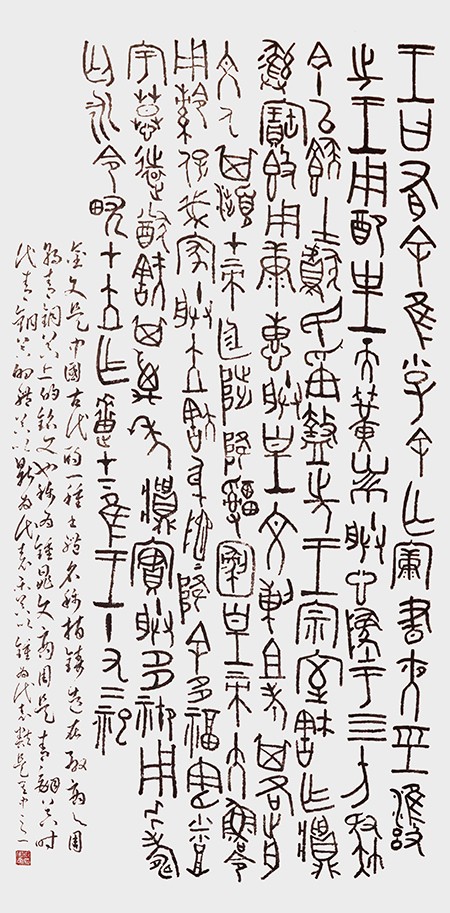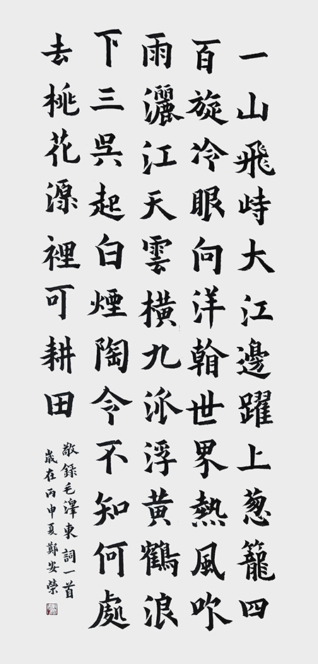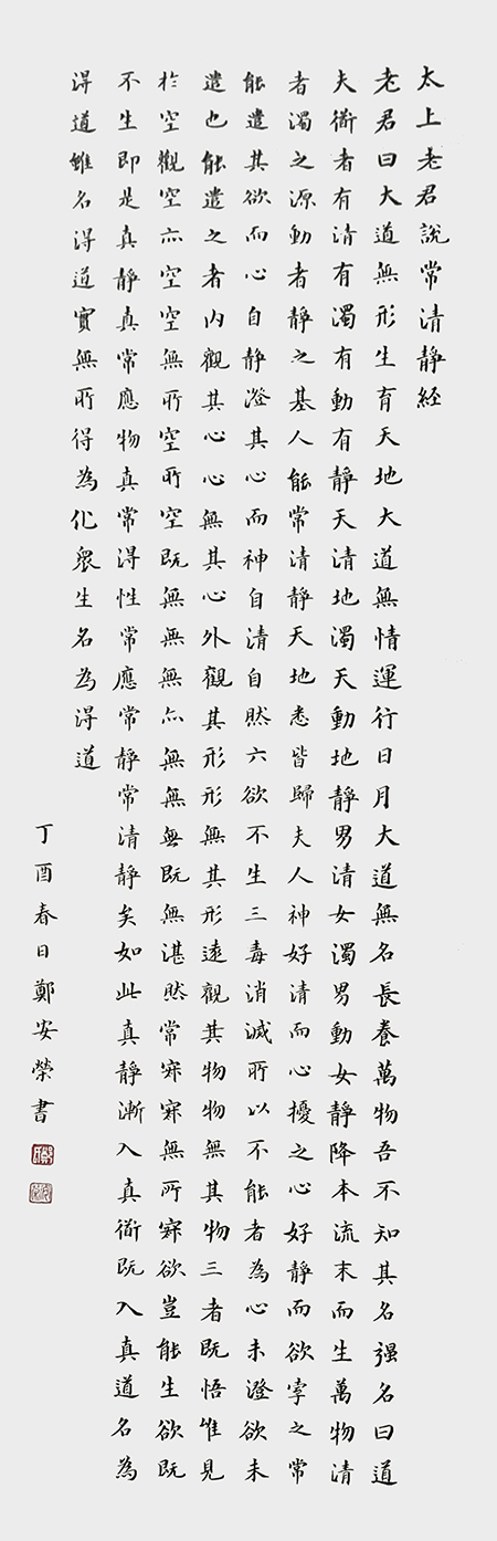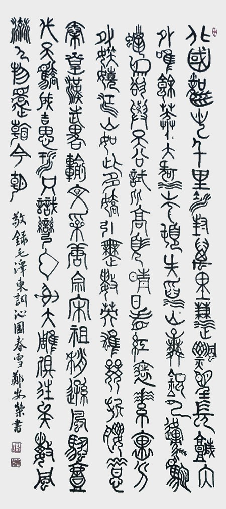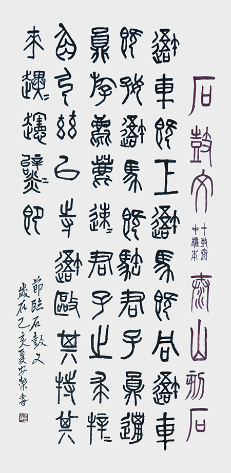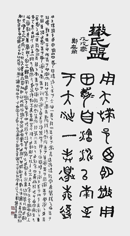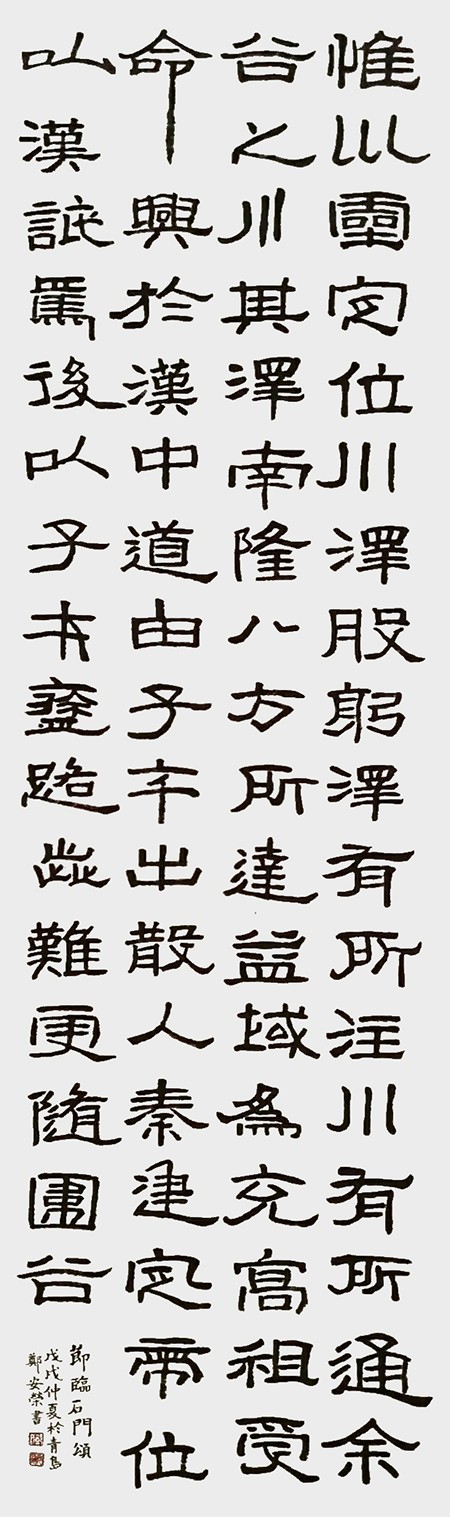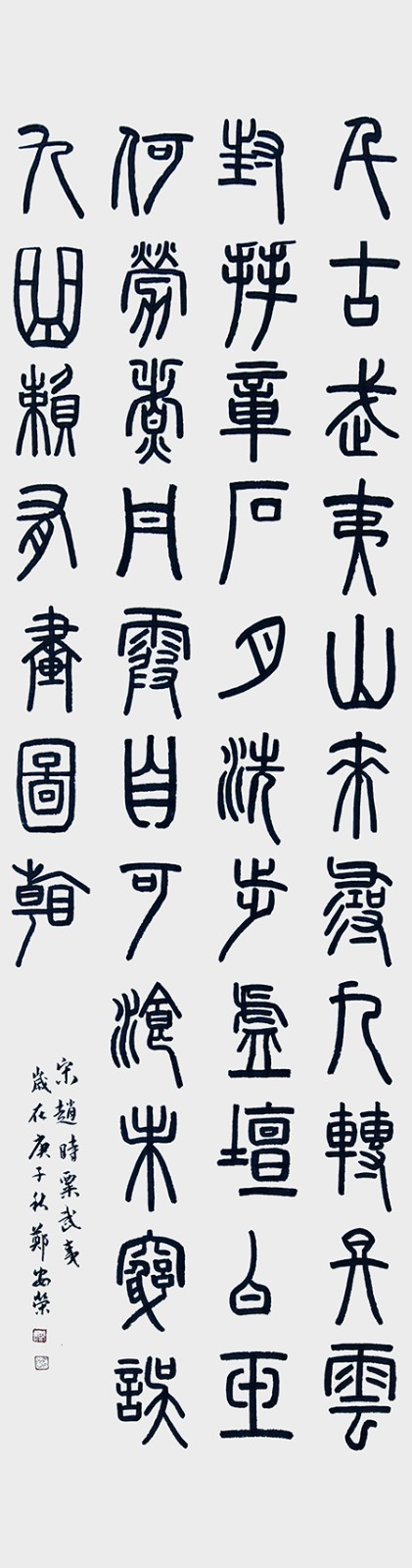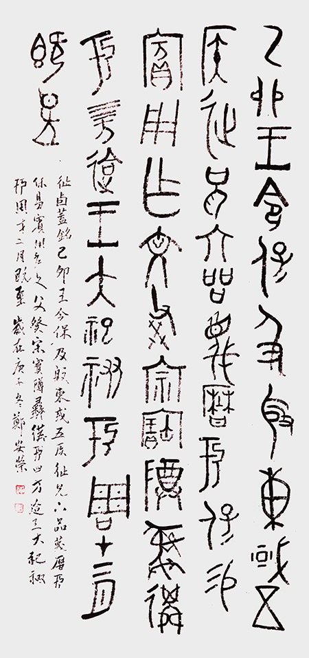 中国民族建筑研究会书画艺术专业委员会理事会理事郑安荣老师致力于民族书法艺术的传承发展、守正创新,潜心于民族书法艺术的临摹创作、研究探索。其篆书古拙典雅、气象高古,金石味浓郁。尤其是其所作《散氏盘》,不仅承传古意,运笔藏头护尾,方圆兼备,且在起伏顿挫、提按转折中融入自身对书法的理解与感悟,使笔法更加灵动多变,更有“草篆”意蕴。其楷书直追颜氏之风,端庄沉稳,凝练厚重,结体宽博而气势恢弘,骨力遒劲而气势凛然。赏其楷书作品,从迹象上讲,俨如屋漏痕般质厚雄肆,浑厚丰满;从神韵上看,其书内涵深沉,意蕴悠远;可以说,其作品既有古意,亦含时风。如今,郑安荣老师毅然承担起新的使命和责任,不辍前行于书法研习之路上,奋力向着更高的艺术之巅攀登,以期为国家、为民族做出自己更大的贡献。
