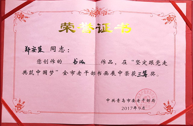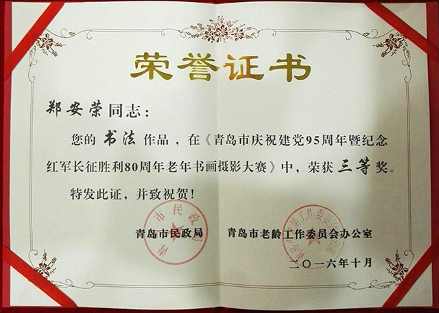 2016年10月,书法作品在《青岛市庆祝建党95周年暨纪念红军长征胜利80周年老年书画摄影大赛》中,荣获三等奖。