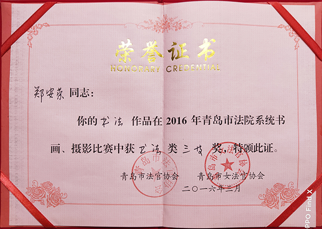 2016年3月,书法作品在2016年青岛市法院系统书画、摄影比赛中获书法类三等奖。