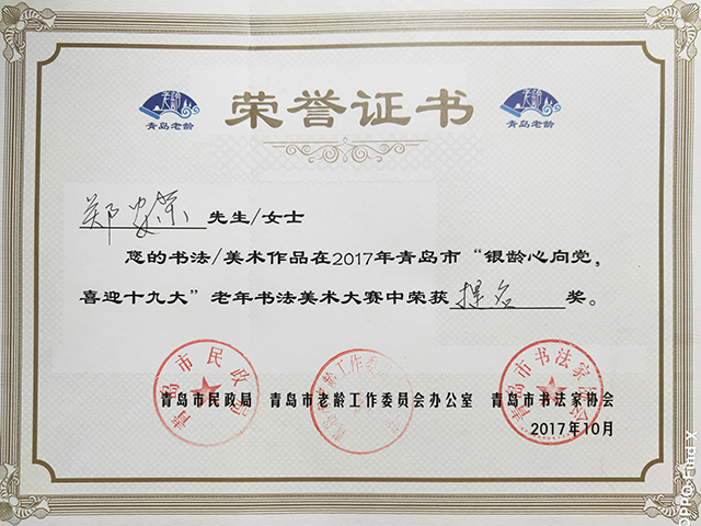 2017年10月,书法作品在2017年青岛市“银龄心向党,喜迎十九大”老年书法美术大赛中荣获提名奖。