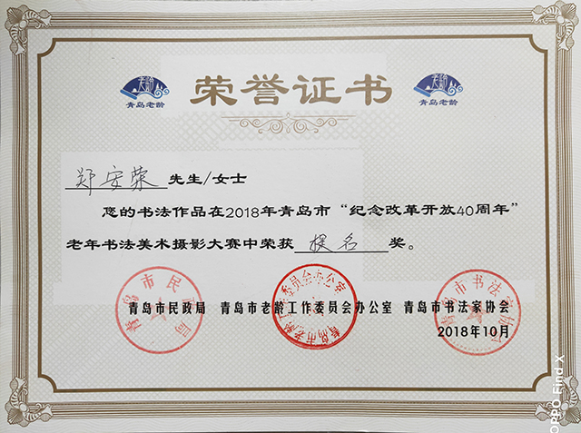 2018年10月,书法作品在2018年青岛市“纪念改革开放40周年”老年书法美术摄影大赛中荣获提名奖。