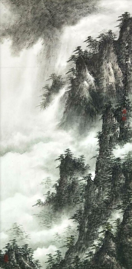 张文山先生的笔下的山水,嶙峋陡峭,云蒸霞蔚,青荣峻茂,气势雄伟,如临其境,摄人魂魄。这与张先生对真山真水的长期观察与体悟,成意于胸是密不可分的。他的作品功成于型,美成于境,精益求精,无可挑剔。山水大像,结构形态、纹理走向、质感气象,笔笔入骨,线线精确。山水造型,笔走龙蛇,变化多端,轮廓用线,长短粗细无不精致,直曲凹凸变化莫测,方圆折顿常成新奇,山水的顿挫连绵,劲健飘逸皆行于笔下,似是天成。这样的山水画,非一时一日而能构成,非常能考验艺术家连续构绘,累以长时而创作精力不减的艺术水准。