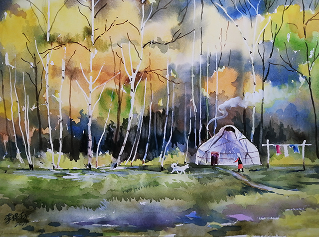 水彩画作品《天山脚下》迎面扑来的是大美新疆的音乐,作品采用Z字型构图,整个画面分上中下三部分,上方是巍峨的雪山和茂密的森林,好似贝多芬D小调第九交响曲的开始,压抑的冰山,郁闷地透不过气,她在讲述着千年的西域沧桑。乐曲渐渐走入舒缓,此时突然,爆发出震天动地的呐喊,欢乐,撕开阴霾,作品的中景出现了明快晴朗的空间,山川树木响起了哈萨克阿肯弹唱会的歌声,视觉中心,两只鸽子的独唱,更使得画面奔放雀跃,左边暖色的出现给我们的内心送来温暖,一种敞怀的心境,在这里抒发,您怎么会不爱新疆。画面的下方,展示的是牧人和牧羊,作者并没有完全写实地刻画,像印象派那样关注意向,水面、牧马、羊群让我们近距离的走进新疆。