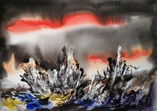 他的作品《秋高》构图是从左往右的张开的三角形,三角形中间,将我们推进非传统的感知世界,天空、植物再也不是我们熟悉的造型,可那旋转的空间,拼命地拉住我们的视线,我们不得不停留,停留,再停留。在停留的过程中,终于看到,粉红色的秋日的果实,那微笑的面容,黄色的秋叶不但没有凋零反而扶着它继续上升,两片上升的鲜红的树叶,舞动着迷人的身姿,出现在视觉中心,活跃奔放,把我们带入天旋地转的色彩空间。