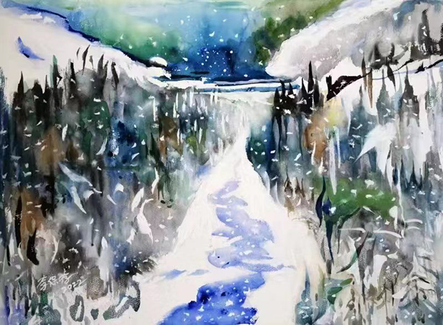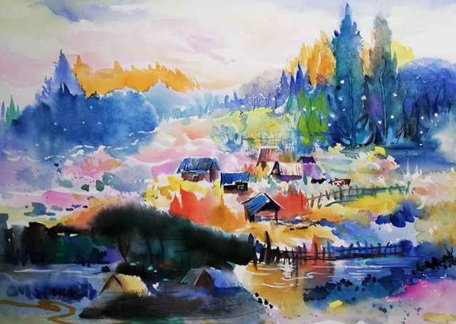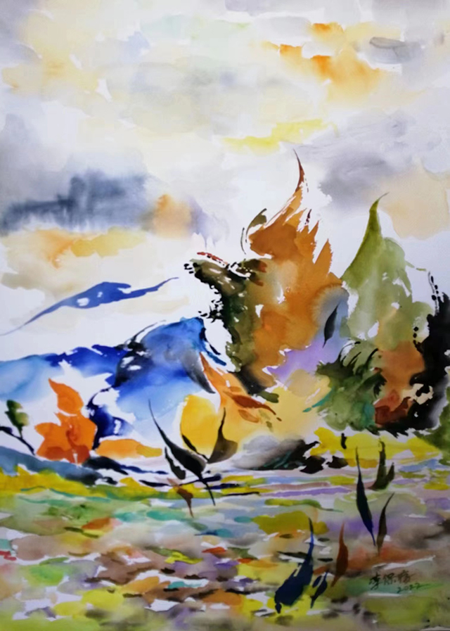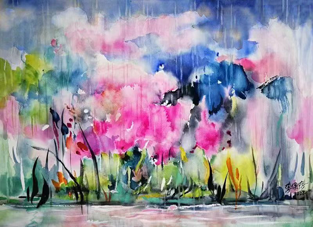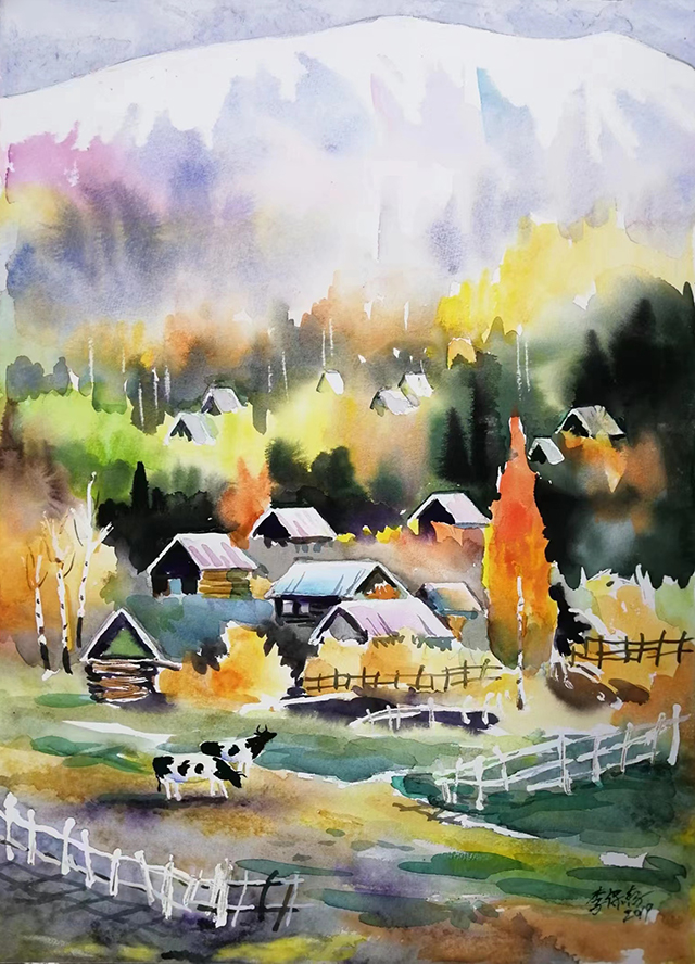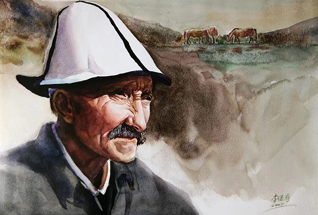 这是李保存先生水彩画带给我们的心灵触动,他的作品直接走入内心,让我们久久地驻足,久久地凝望,那种久违的,亲切的场景,似乎梵高正走向我们,可他又不是梵高,他没有梵高那样大起大落的生活经历,也没有梵高那样生死存亡的坎坷命运,为什么?这火热的画面把我们带进对印象派对梵高的色彩盛景。其实,不经历彷徨,不经历绝望,不经历狂喜,通过读书,通过学习,通过思考也可以达到这一境界,这种间接体验,情到深处,也同样是那样的感人。当您阅读他的作品,就迎面冲来,梵高的某种特性,可他又是中国人,在印象派的视觉冲击里,又燃烧着中华脉搏的流动,只有深入了解李保存先生的艺术人生,才能体会到他的根,是如何扎在祖国这块肥沃的土壤中。他是天津蓟县人,父亲是军人,他随父亲跟部队进新疆,所以在他的艺术人生里就出现了军人的坚韧,锲而不舍,勇往直前的个性。他在祖国新疆从事美术教育并在那里创作写生,因此他的作品散发着祖国西部的泥土的芳香。我们说母亲是孩子的第一盏明灯,李保存最初爱上艺术也是因为母亲,从记事起他就被母亲深深吸引,母亲那优美的轻轻的歌声,尤其她手里绣出的鲜花,把他带去长长的美妙的睡梦中。一块布,神奇地降临了各色鲜花,妈妈的绣花鞋,引起了他对艺术的强烈热爱,那布局均匀的设计构图,那上下飞动的绣线,那一反一正的闪亮针法,还有妈妈那幸福地笑容给他埋下了深深的美的种子,他爱上了艺术。他开始了美术的学习。