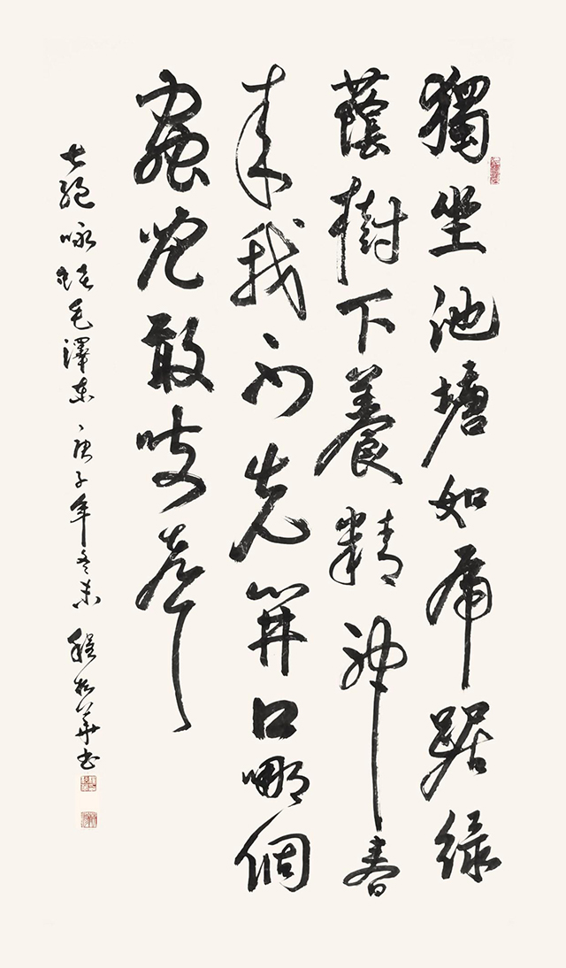 艺术是文化的载体,文化是艺术的根本,任何艺术形式都应该承载在广阔丰美的文化内涵,脱离文化的艺术,不管多么花哨,都如过眼烟云,昙花一现。程松华早年以诗词著称,在诗词的滋养中,书法也自然而然地成为当代书坛关注的焦点。程松华把传统文化的精髓与质地洁美的书法融成精妙,把文人的细腻嫁接在跌宕起伏的书法视觉之中,在书法与词章之间探寻一种平衡,让书法艺术之美与诗词意境之美互生奇妙。当打开程松华的书法,扑面而来的视觉美感和飘逸洒脱的文人气息弥漫其中,那遒劲的线条,那酣畅的笔墨,那典雅的结构,在黑与白的世界里,激荡着无限的视觉张力,渗透在笔端的风华演绎着程松华的书法感悟、词章妙悟和人生哲学的高度结晶,如奏响的旋律、诗歌的意韵、画境的美妙,让笔者留恋回味,犹如品尝久违的陈年佳酿,浓郁中带些甘甜,醇香的余韵,飘荡四溢。