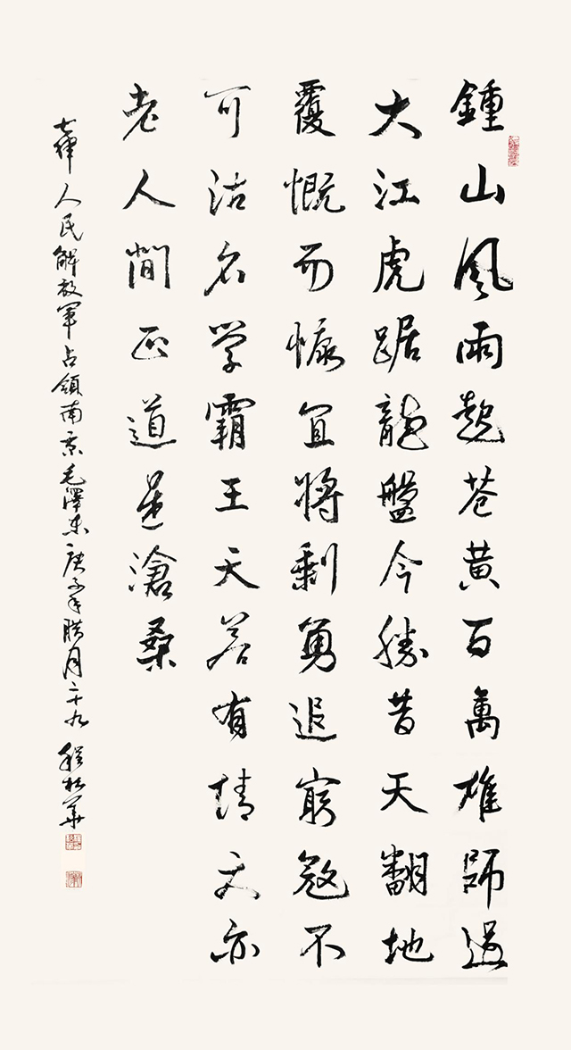 当笔者一遍一遍地细品程松华的书法创作,首先让笔者感叹的是行楷书,在《摘三国开篇词》、《李白诗词》、《杜甫诗句》、《自作诗摘写》等等作品中,柔与刚、方与圆、正与斜、静与动,对立中彰显和谐,丰富中凸显个性,结体飘洒,笔意连韵,“王氏”气息随处可见;线条遒劲隽美、含蓄多变,涌《兰亭》之典范;章法布局统合一体,隽永蕴藉,聚《圣教》之柔逸。宽博厚重的大精神,在方格之内涌成大气,功力上乘的大手笔,在咫尺宣纸之中书写天地之阔,洒脱严守法度、飘逸尽显真功、险峻而不离庄重,精彩纷呈,神采飘逸。程松华在行楷书的创作中,似若无意地融入思辨的理性、艺术的才情、诗意的空间,却在点画与线条之间,跌宕着美轮美奂的交响,充满张力无限的视觉美感,凝聚着程松华百炼成钢的锻造过程,彰显出程松华精神情感和书法人生的双重叠加。