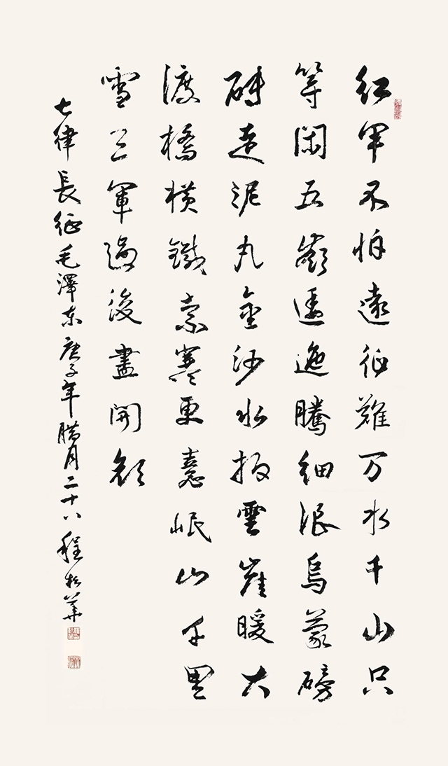 程松华精楷书、攻篆隶,尤擅行草,纵观程松华的书法,不管是雍容端庄的楷书,还是飘逸洒脱的行草,从中可以清晰地感受到,他有着深厚的传统功力,几十年来,程松华以法度严谨的“楷书四家”筑基,以王羲之的《兰亭序》、《圣教序》为重点突破对象,取兰亭之意韵、圣教之隽永,草书则以《孙过庭书谱》、《三希堂草书》为蓝本,用情最浓、用功最勤,并兼学怀素、张旭的飘逸之势,同时,上溯篆隶,得古朴浑穆,下及明清诸体,得骨韵苍秀,旁参近代名家,得金石风神,手摩心追古圣先贤,广收博取,朝夕临帖摹碑,融会贯通,有时为解决一个笔法,有时为理清一个论点,有时为妙悟一处心得……,他废寝忘食,甚至夜不能寐,每有会心之处,便拊掌跳跃,几近痴迷,在“望尽天涯路”的追求中,耐住“昨夜西风凋碧树”的孤寂,挣扎、迷茫、蜕变、蝶化,终于实现“独上高楼”的领悟,家中堆积如山的书法习作就是“众里寻他千百度”的收获。
