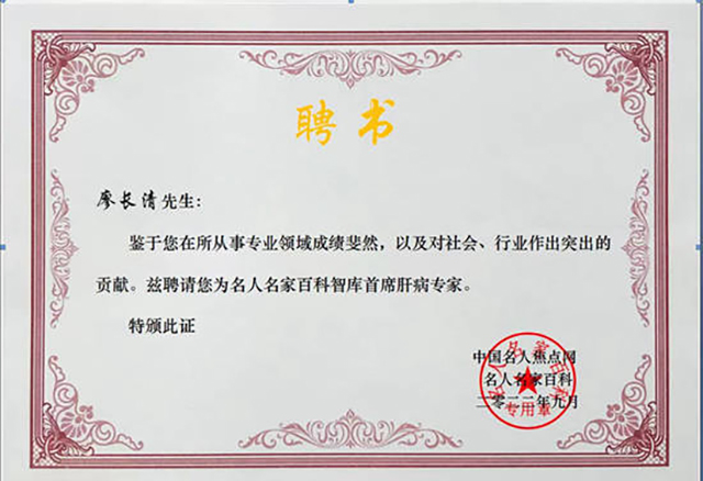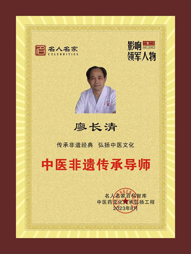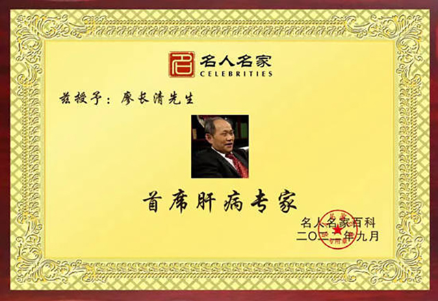廖长清,中国当代名医,全国著名肝病专家,中华名医理事会副会长。出生于中医世家,少年师承中医,从医60年专治肝炎、糖尿病等,学验具丰。多年来使无数患者转危为安,重获新生。2016年在北京,参加“第四届中国主任医师学术年会”,受到了第九届全国人大副委员长、两院院士吴阶平,中国医师协会会长殷大奎等领导的亲切接见。并作了大会发言,获得优秀论文二等奖,并载入《中国当代思想宝库》一书。发表有论文10多篇,编著有《揭开乙肝无法转阴的神秘面纱》、《中医辨证论治肝硬化临床应用》、《廖长清糖尿病的禁忌与食疗》、《肝病的禁忌与营养》、《科学吃水果疾病远离我》等书。多次接受中央电视台专访。2020作为中医药行业杰出代表被中国影响力人物数据库收录,永载史册!2022年作为著名肝病专家被中国名人焦点网-名人名家百科收录,并授予“行业影响力领军人物”称号。