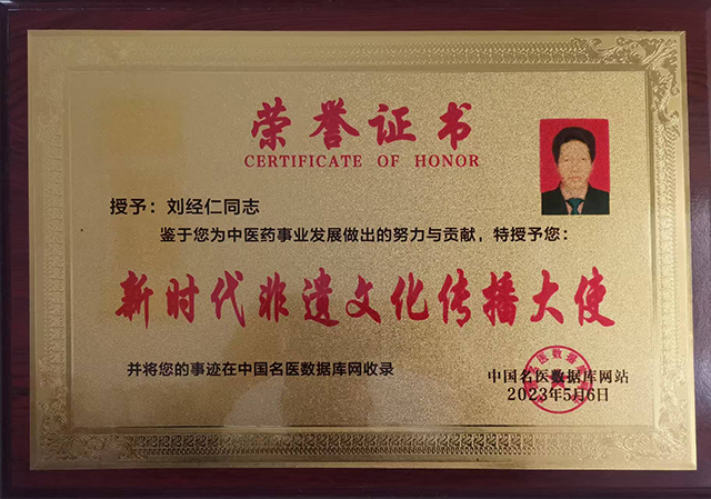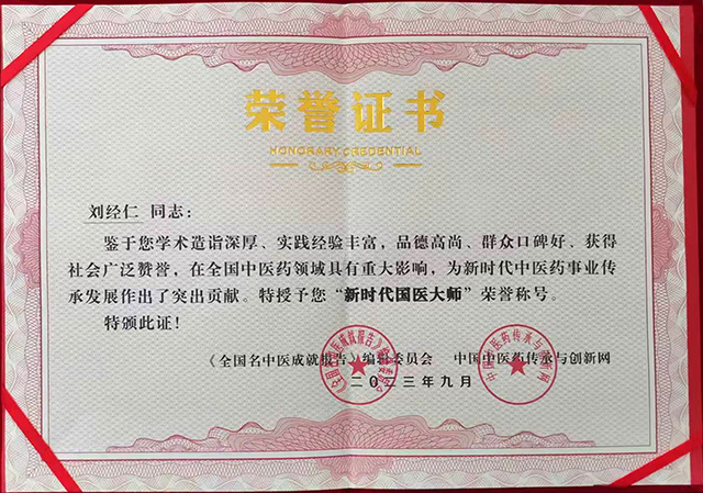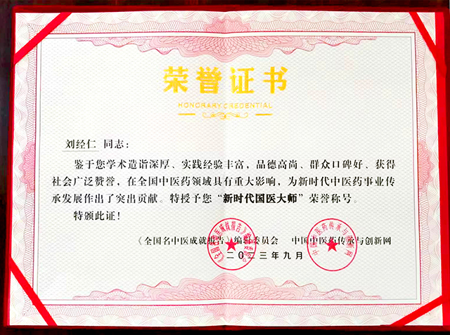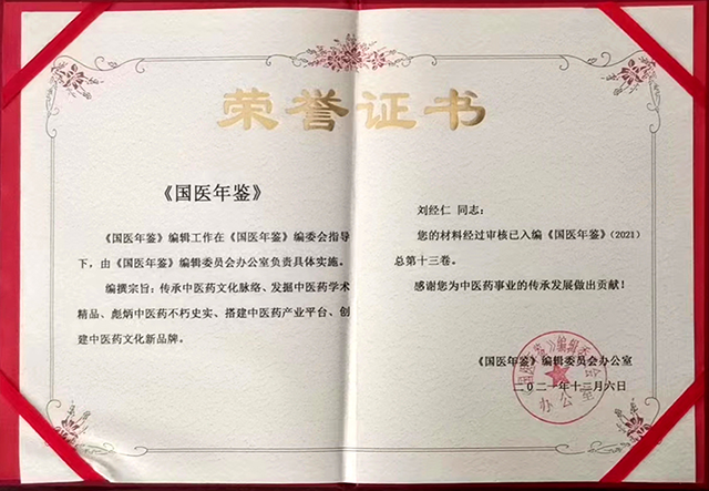 很多患者反馈疗效满意,慢慢地,老中医,中医全科,中医全科专家就传开了。2020年12月,北京百年浩瀚中医研究院授予刘经仁“中医全科专家”,2021年6月收录入张仲景博物馆官网。