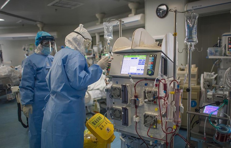 3月21日,在武汉市汉口医院肾内科血液透析室,医护人员为处于新冠肺炎康复期的尿毒症患者做血液透析