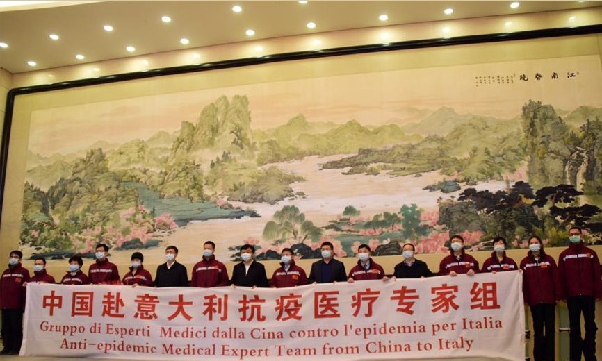 3月17日,浙江省组建的中国抗疫医疗专家组一行12人启程赴意大利协助应对疫情。这是抗疫医疗专家组成员出征前合影留念