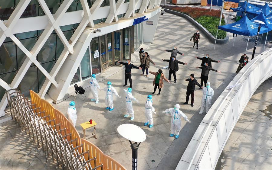 3月10日,在武汉江夏方舱医院,医护人员教患者练习八段锦(无人机照片)