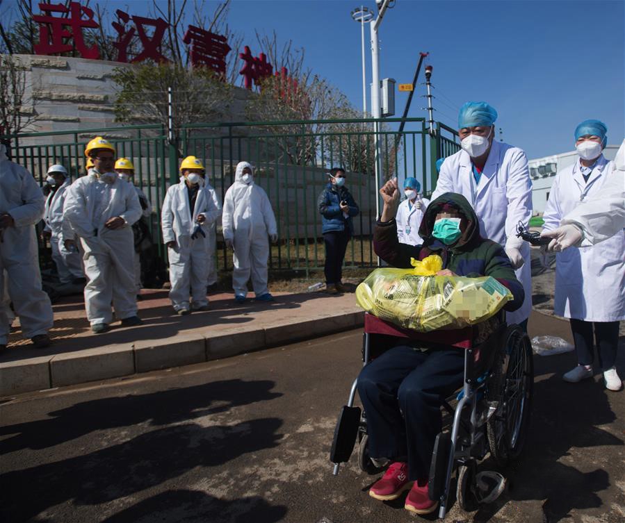 2月18日,在武汉雷神山医院,83岁的治愈患者挥手致意