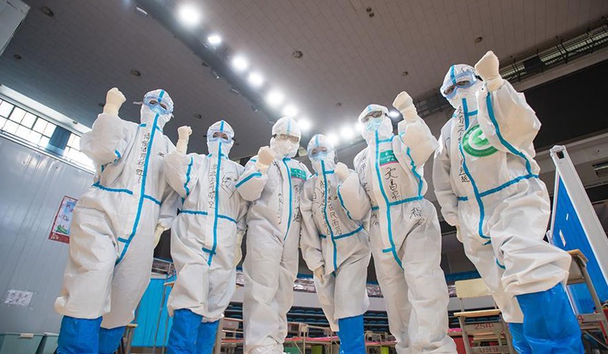 3月10日,武汉武昌方舱医院正式休舱,医护人员送走新冠肺炎治愈患者后摆造型合影留念