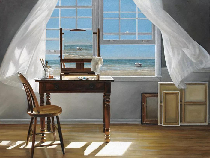 同样是夏天,同样是在海边,英国画家Karen Hollingsworth更着迷于光影通过窗户透进房子的瞬间。海风将纱帘轻轻地吹开,裹挟着一股淡淡的腥味,木桌上的画笔和颜料被金黄灿烂的阳光拂过,似乎有了生命力。Karen抑制不住心里的激动,快速拿起画笔,将眼前的景色定格在画布上,作品名称也很写实,就叫《窗外起风了》。