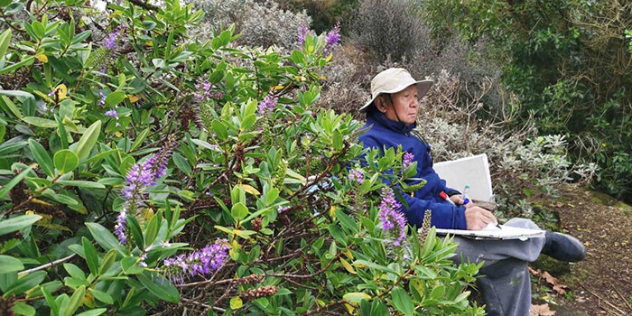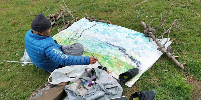 因为观察方法不同,作画时的李玉双以眼球正中捕捉客观事物形成的二维画面,看起来像是在盯着前面的空气。他习惯一边打坐,一边画画,似乎全身心都在感受自然。因为在户外作画,难免有人凑热闹来看,他充耳不闻,实在被打扰到,他则站起来打打太极。他描绘自己的状态说:“到了画画的地方,先坐下来,看着风景,把‘小我’放下,接着还要把‘大我’放下,最后达到‘无我’了才开始画起来。‘无我’状态中,我和自然界融合在一起了,这时候画就不一样了。”