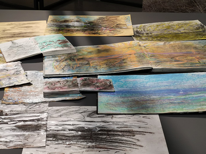 《河岸边(艳芳走过的路)》 100×201cm 纸本丙烯水墨 ,在这张记录了多次写生的时间