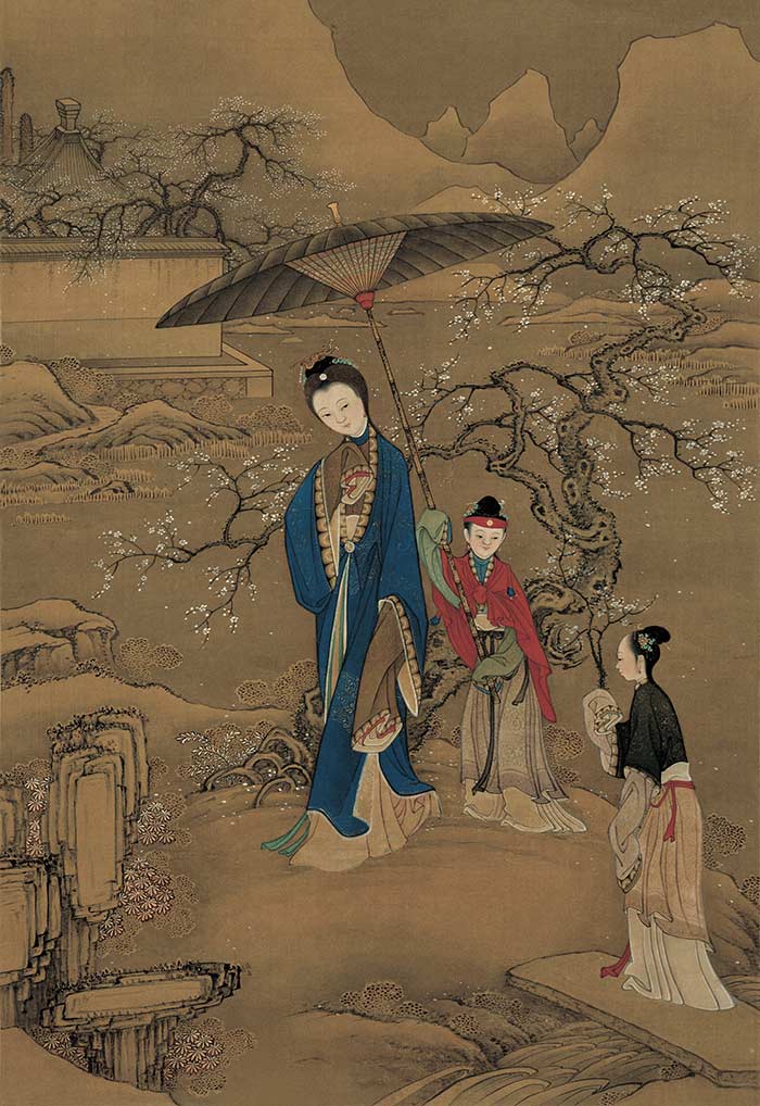 清代宫廷画家众多,画仕女的以焦秉贞和冷枚师徒为代表。康熙时期,焦秉贞成为天主教教主汤若望的门徒,官至钦天监五官正(从事天文历法事务)。而西洋传教士布道时常以宗教画为宣传工具,又因后期结识绘画大师郎世宁,因此在耳濡目染之下,焦秉贞学得了西画中透视和明暗等技法。山水、花鸟、人物画均是他涉猎的题材,而他的仕女画多有一股富贵之气,用笔细腻、设色明艳、意境悠远。