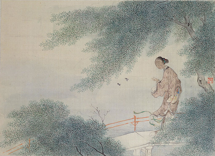 (清)费丹旭《十二金钗图册(十二开)——宝钗扑蝶》