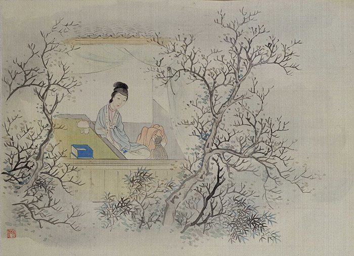 (清)费丹旭《十二金钗图册(十二开)——李纨读书》