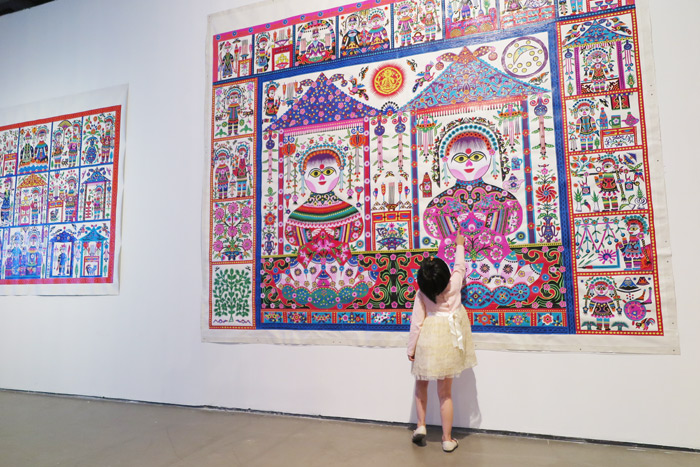 库淑兰,《剪花娘子与剪花姑娘》神台,油画布背底、纸质画面,238×304cm,1988
