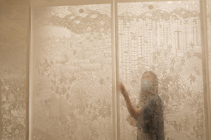 关于“剪纸”,最先浮入脑海的是逢年过节的窗花,幼儿园用“对称原理”剪出的雪花、小人儿,甚至是节日贺卡里的立体造型,那么艺术家们又如何拓展它的维度呢?